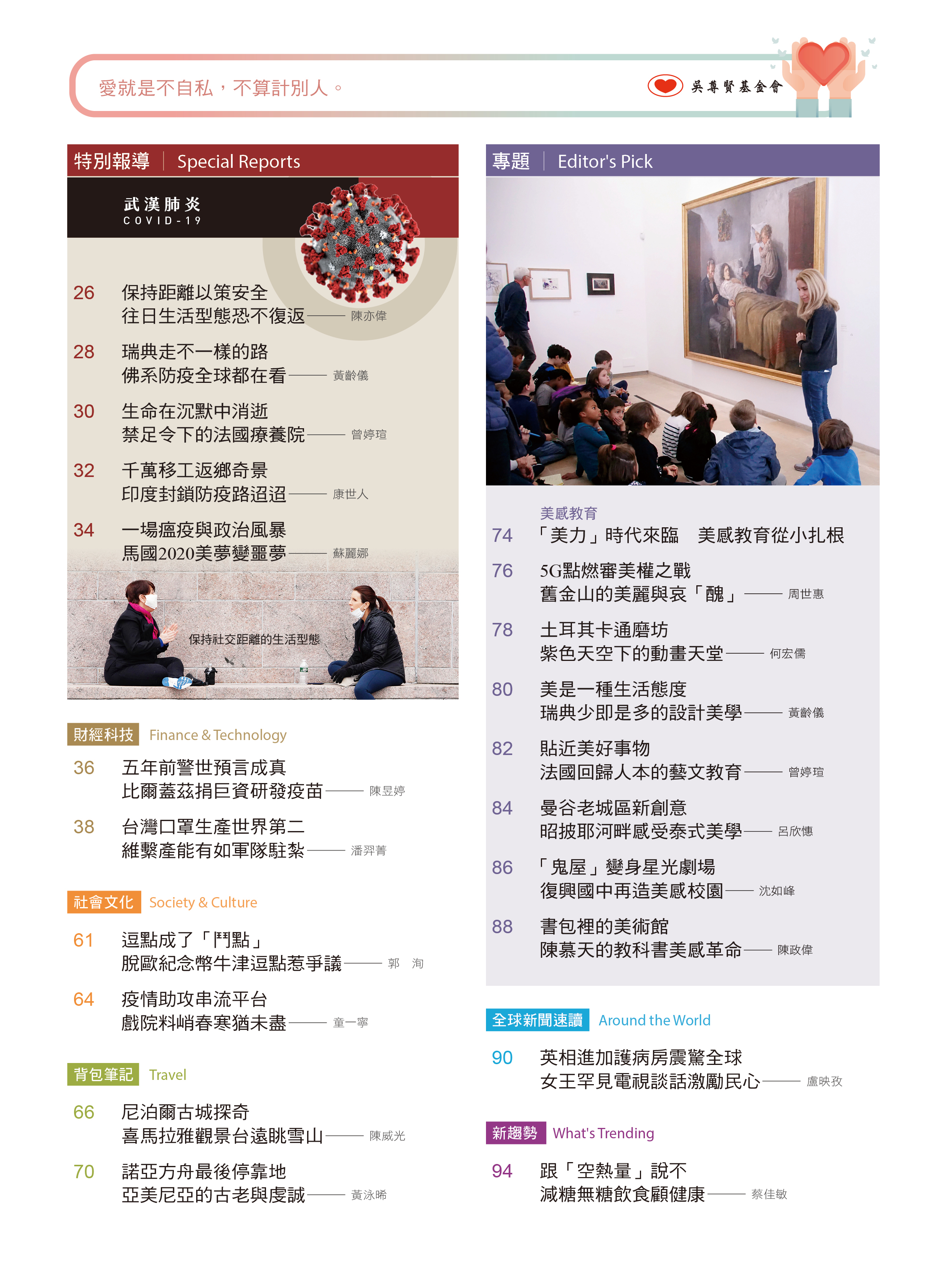 專題〈美感教育〉從舊金山的審美權之戰出發,了解當地人如何看待城市美感,以及土耳其色盲畫家啟發下一代美的想像、瑞典「少即是多」的設計美學、法國回歸人本的藝文教育與宜蘭復興國中再造美感校園等,一起思考在生活中創造美感、體驗美感,進而教育美感。(詳見74頁)