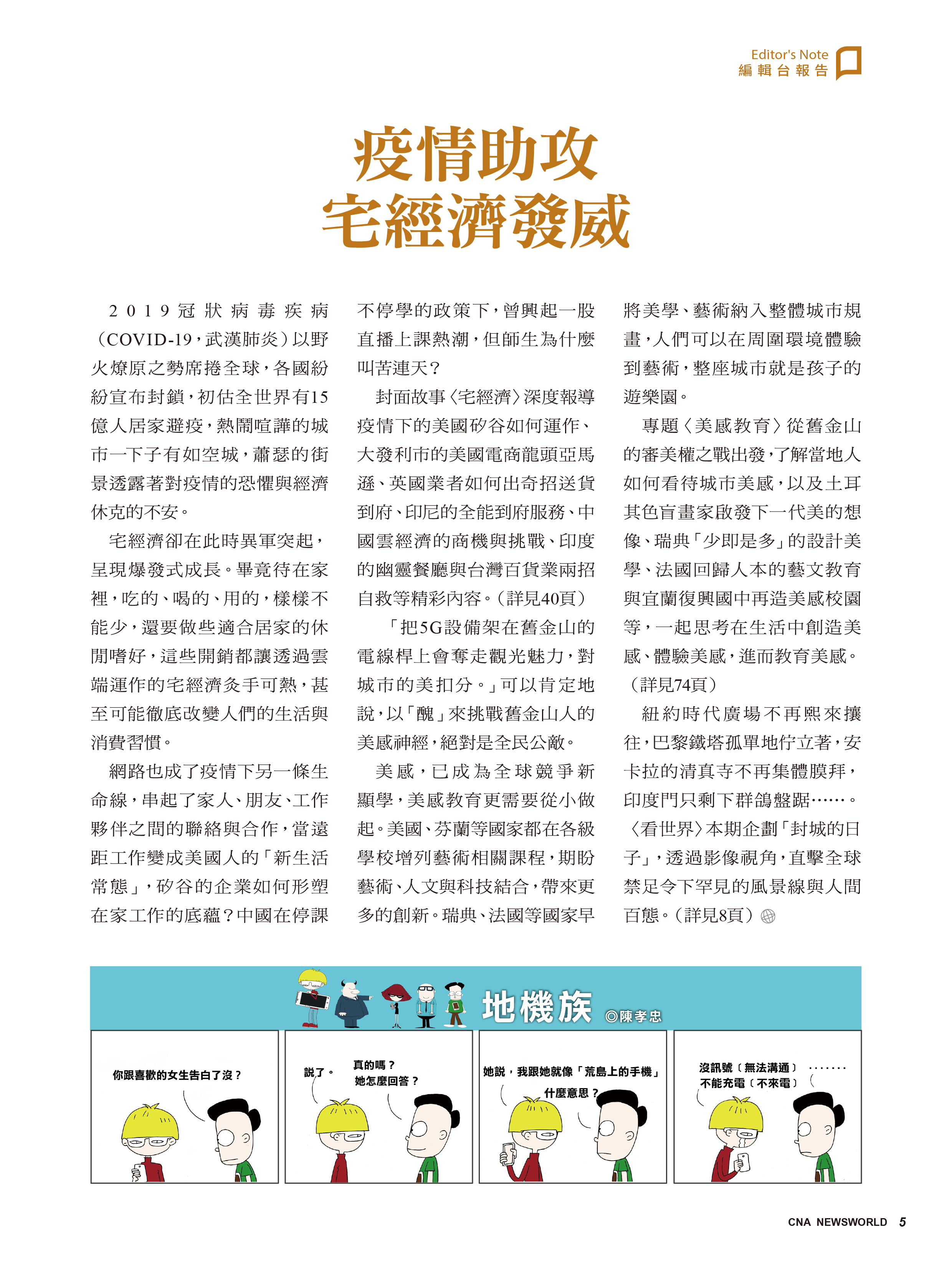 封面故事〈宅經濟〉深度報導疫情下的美國矽谷如何運作、大發利市的美國電商龍頭亞馬遜、英國業者如何出奇招送貨到府、印尼的全能到府服務、中國雲經濟的商機與挑戰、印度的幽靈餐廳與台灣百貨業兩招自救等精彩內容。(詳見40頁)