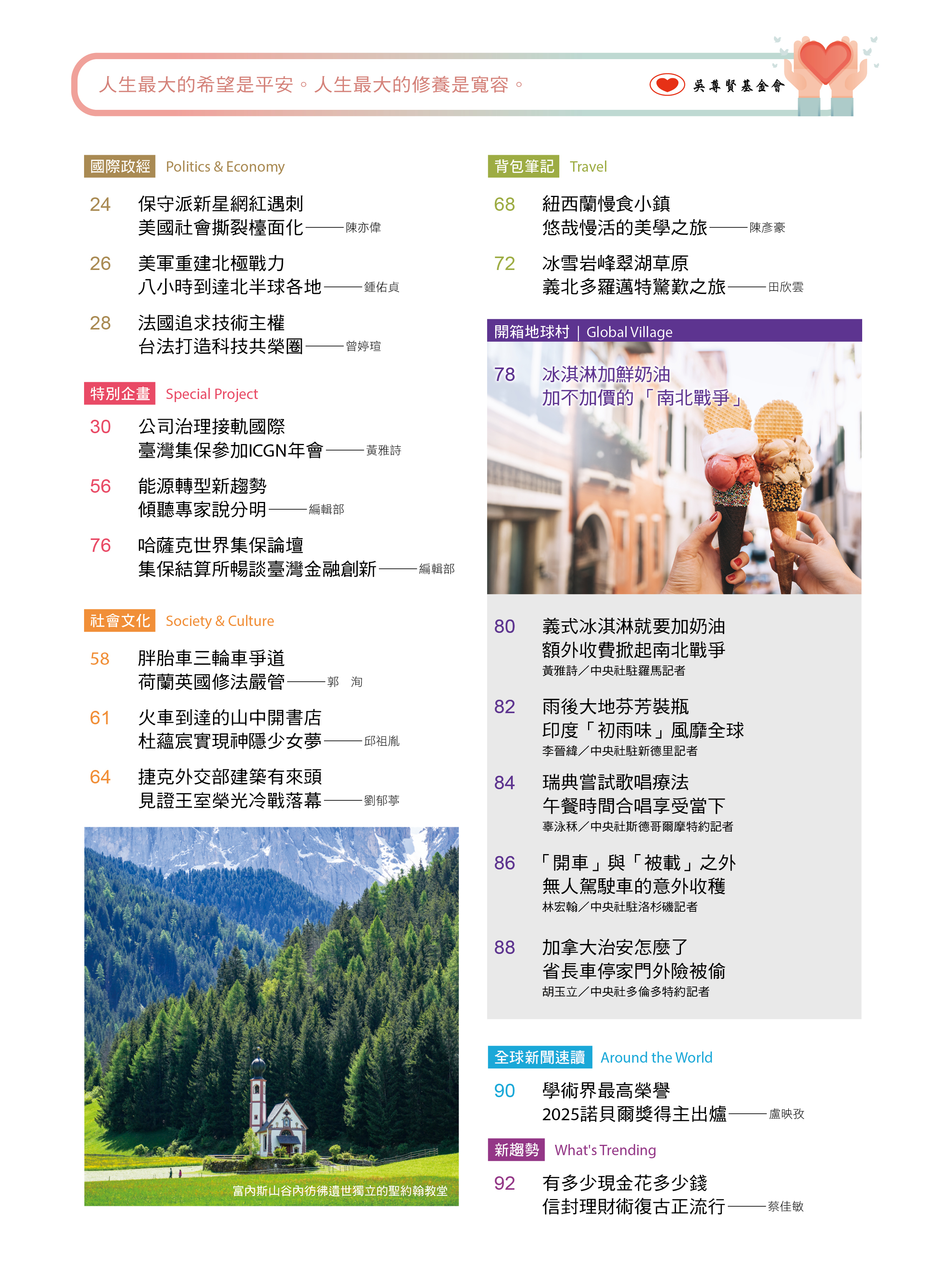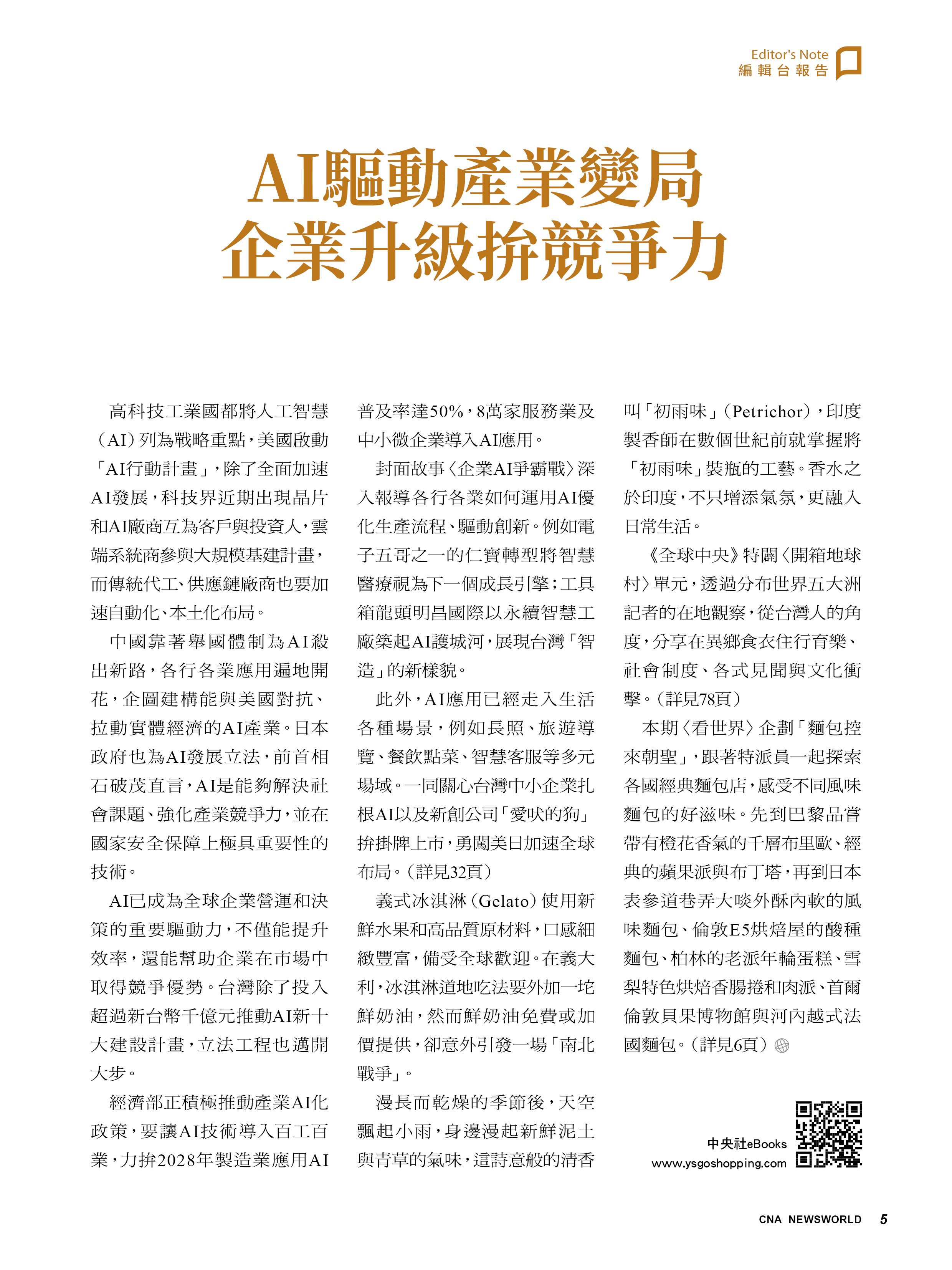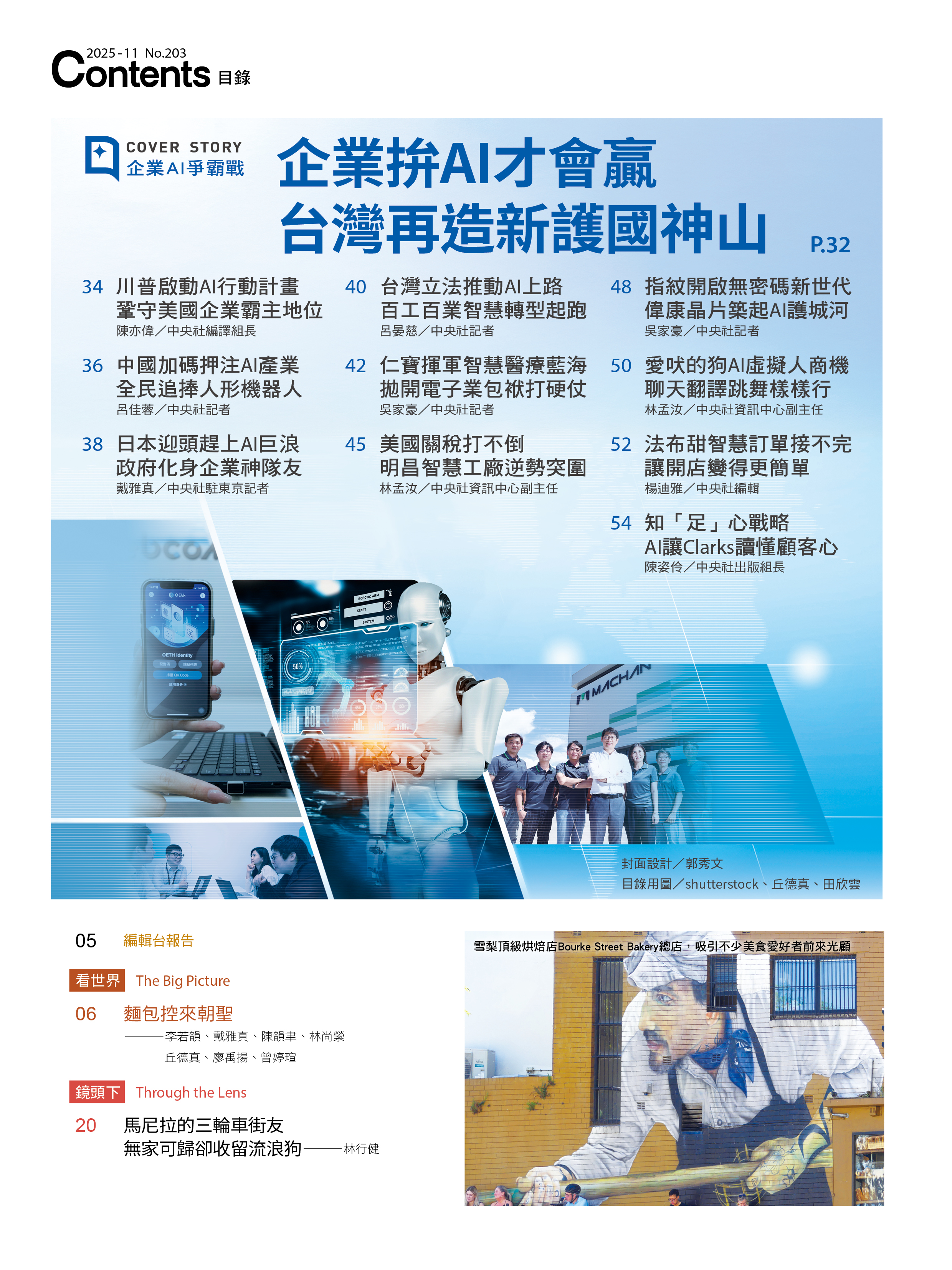 封面故事〈企業AI爭霸戰〉深入報導各行各業如何運用AI優化生產流程、驅動創新。例如電子五哥之一的仁寶轉型將智慧醫療視為下一個成長引擎;工具箱龍頭明昌國際以永續智慧工廠築起AI護城河,展現台灣「智造」的新樣貌。