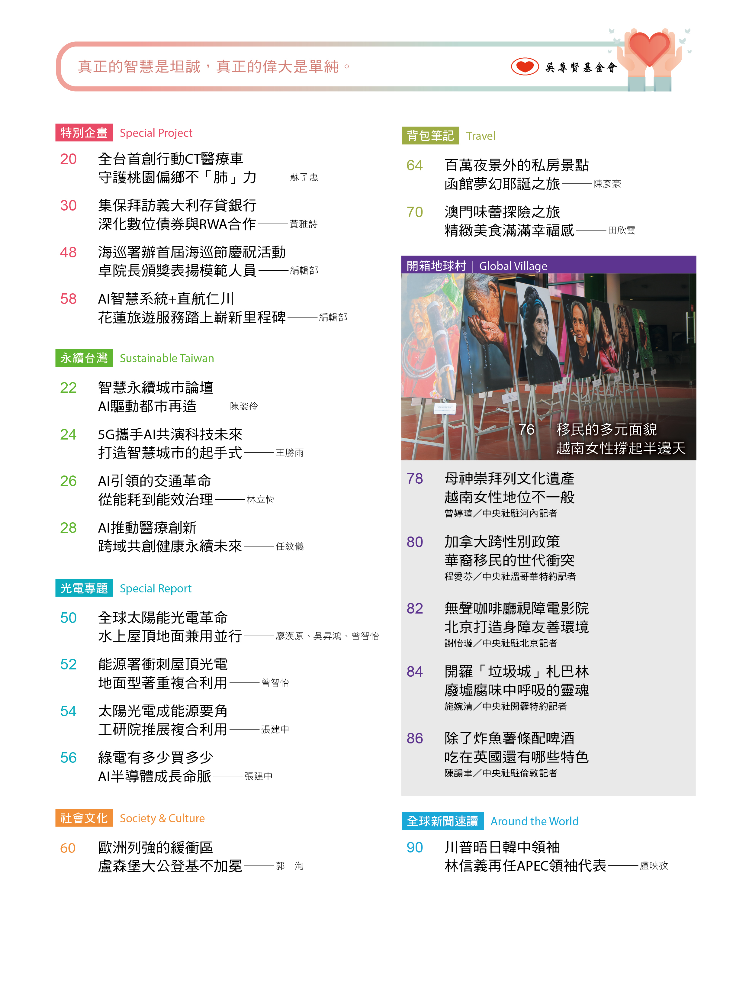 《全球中央》特闢〈開箱地球村〉單元,透過分布世界五大洲記者的在地觀察,從台灣人的角度,分享在異鄉食衣住行育樂、社會制度、各式見聞與文化衝擊。(詳見78頁)
