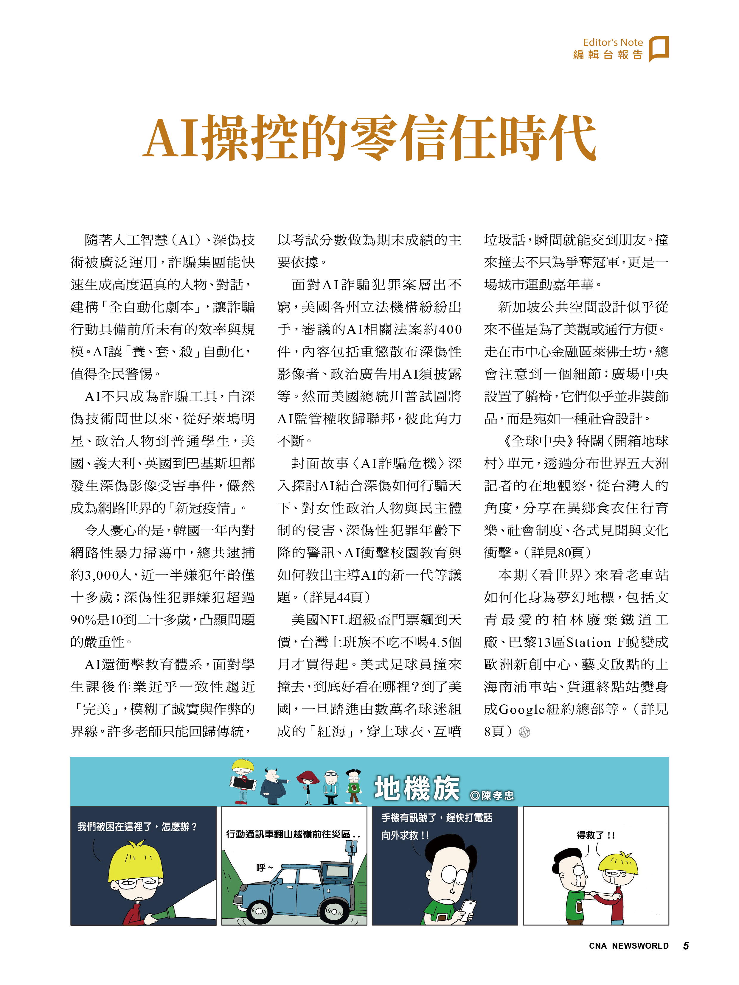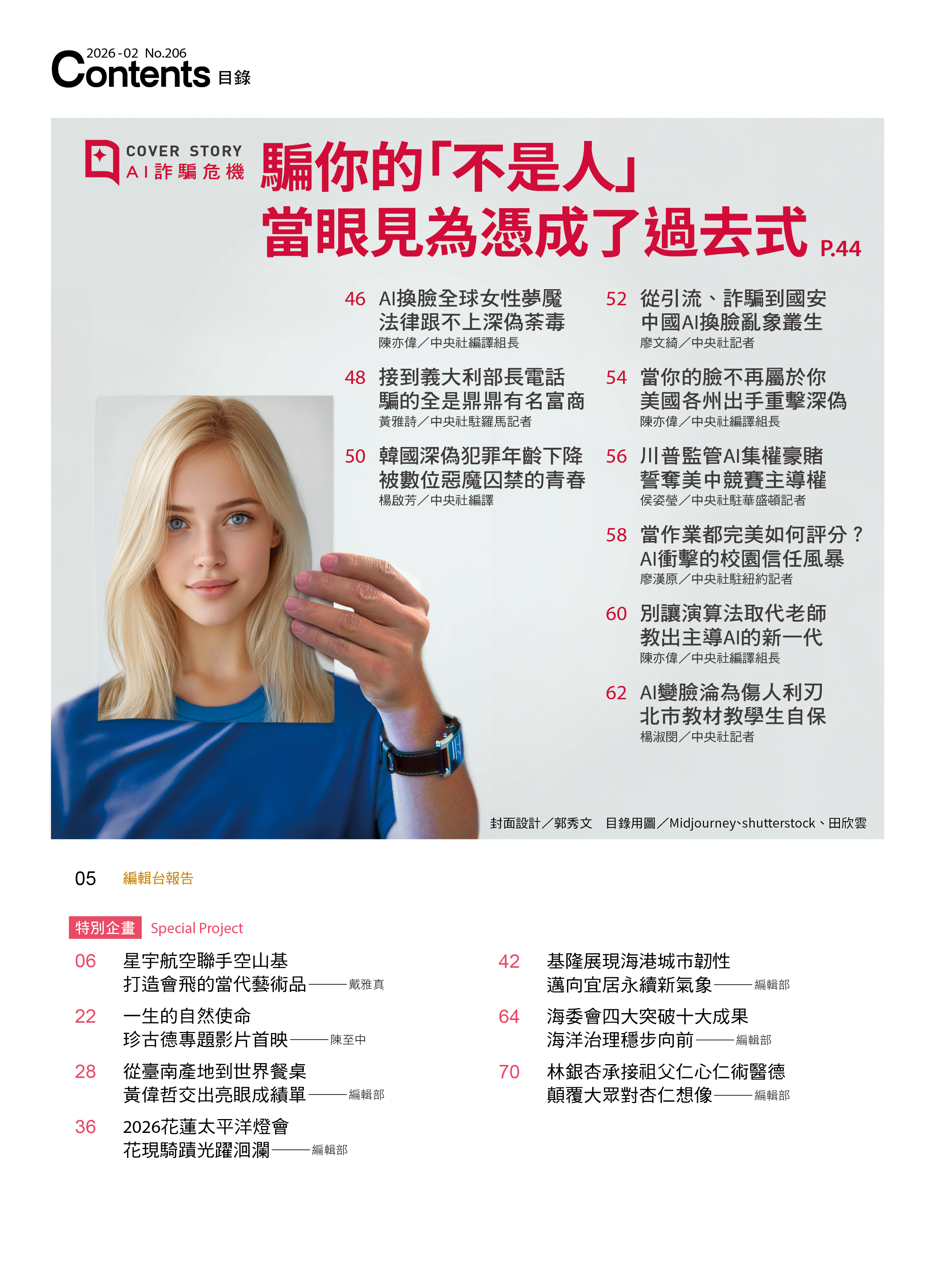封面故事〈AI詐騙危機〉深入探討AI結合深偽如何行騙天下、對女性政治人物與民主體制的侵害、深偽性犯罪年齡下降的警訊、AI衝擊校園教育與如何教出主導AI的新一代等議題。(詳見44頁)