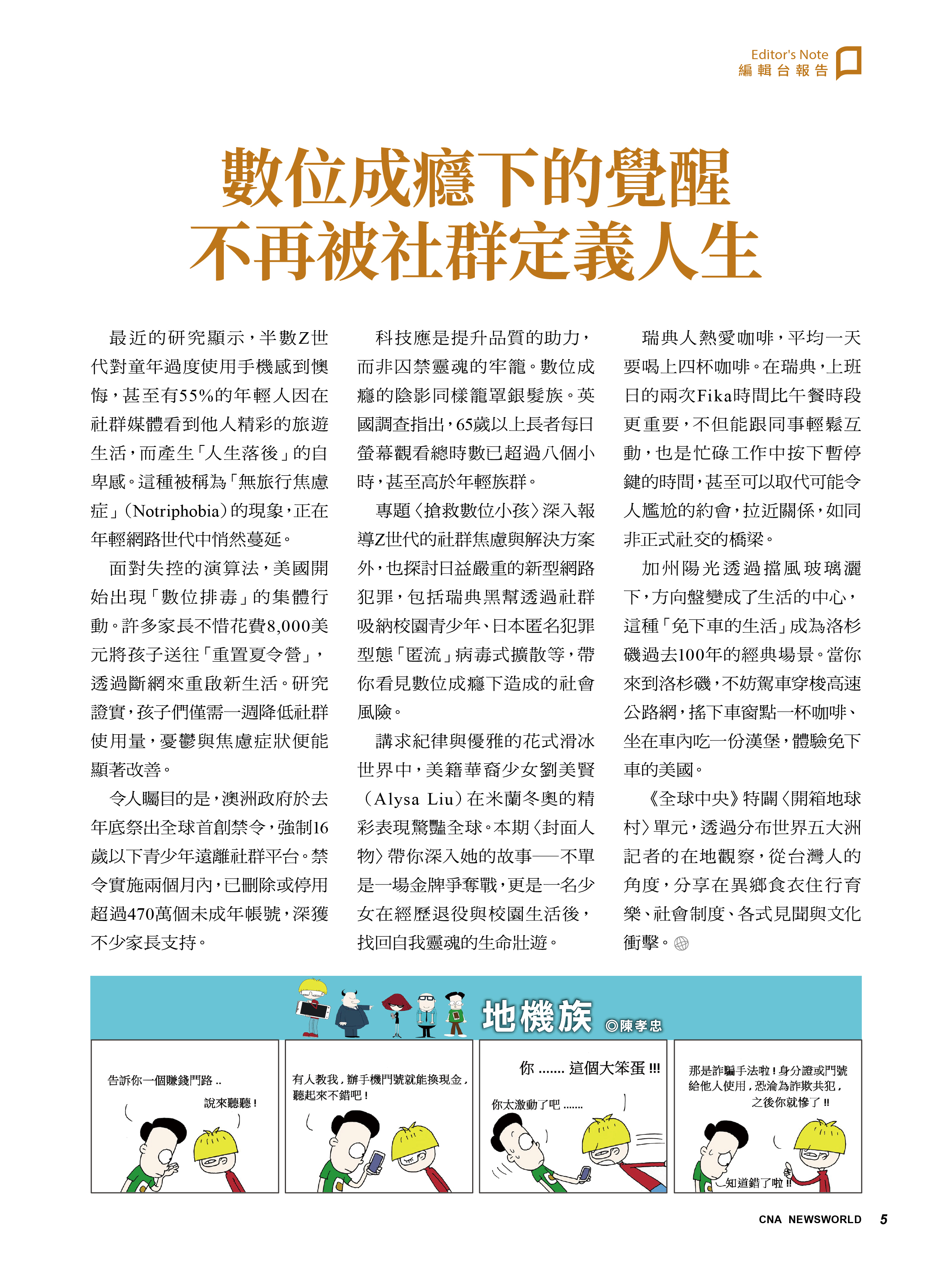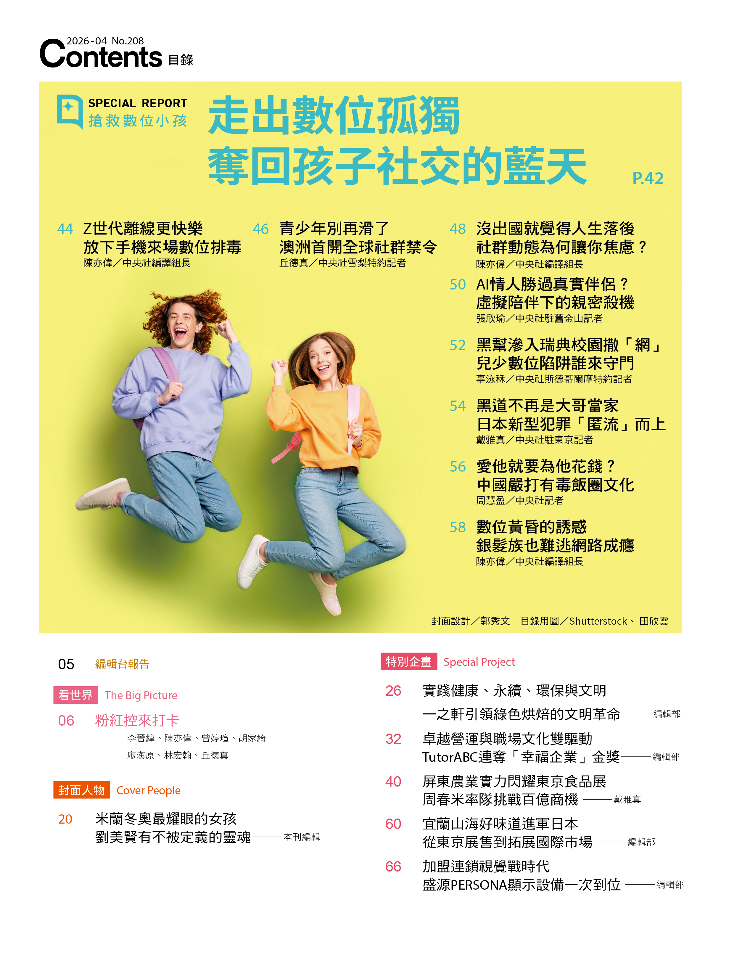專題〈搶救數位小孩〉深入報導Z世代的社群焦慮與解決方案外,也探討日益嚴重的新型網路犯罪,包括瑞典黑幫透過社群吸納校園青少年、日本匿名犯罪型態「匿流」病毒式擴散等,帶你看見數位成癮下造成的社會風險。